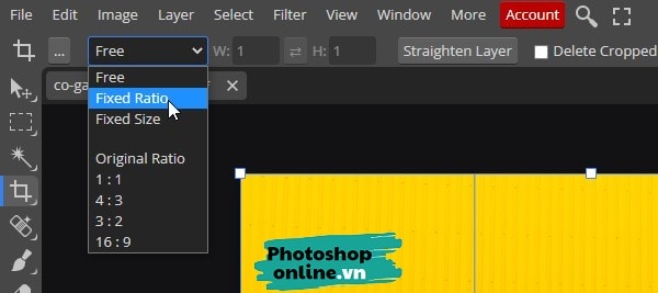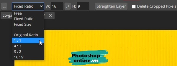 Một vài kích thước ảnh phổ biến đã có sẵn trong Photoshop online nên bạn chỉ việc chọn tỉ lệ muốn cắt là được. Mặc định sẽ có sẵn tỉ lệ 1:1 (Cắt ảnh hình vuông), 4:3, 3:2, 16:9.