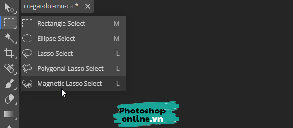 Bước 2: Bạn nhấp chuột phải vào biểu tượng hình chữ nhật nét đứt (Rectangle Select), tiếp đó chọn Magnetic Lasso Select trong menu thả xuống.