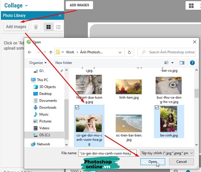 Bấm vào ADD IMAGES ➜ chọn tiếp nút Add images ➜ Tìm đến thư mục chứa ảnh rồi chọn 2 ảnh bạn muốn ghép ➜ Bấm Open.