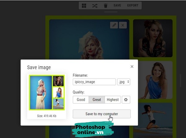 Bạn bấm nút SaveSave to my computer để lưu ảnh xuống máy tính. Ở đây ta có thể đặt tên cho ảnh, chọn chất lượng hay chọn đuôi ảnh là JPG hay PNG.