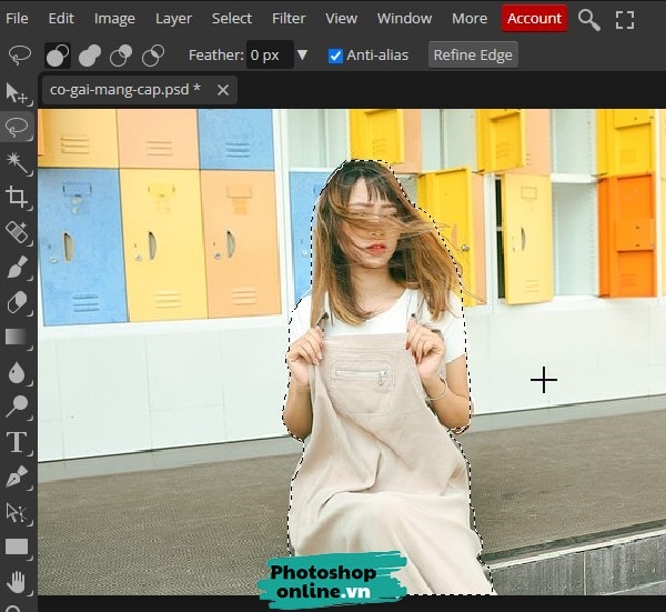 Đầu tiên nhấp chuột để tạo ra 1 điểm neo sau đó di chuyển chuột để Photoshop online tự chọn vùng cho bạn, chú ý tạo ra nhiều điểm neo để vùng được chọn chính xác hơn.