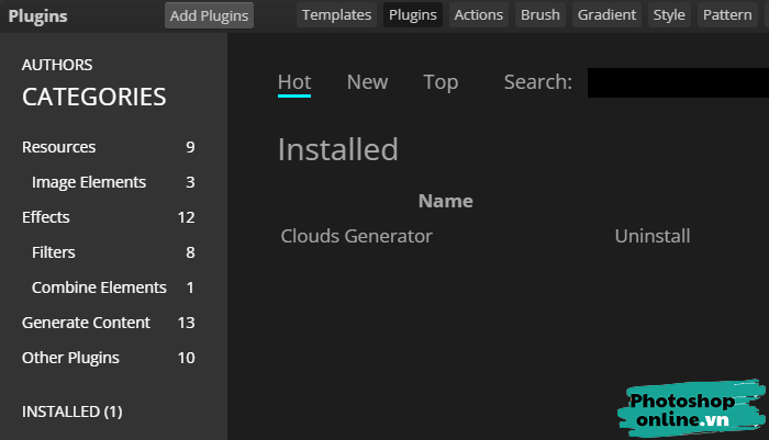 Bạn có thể gõ từ khóa (Tiếng Anh) vào để tìm plugin muốn dùng. Còn không, có thể tìm plugin theo thể loại ở bên trái. Ngoài plugin, bạn có thể tải và sử dụng Template (Mẫu thiết kế), Action (Cho phép bạn tự động hóa một thao tác nào đó, ví dụ như tự động cắt ảnh và thêm chữ vào ảnh), Brush (Nét mực)… Nó nằm ở trên cùng đấy.