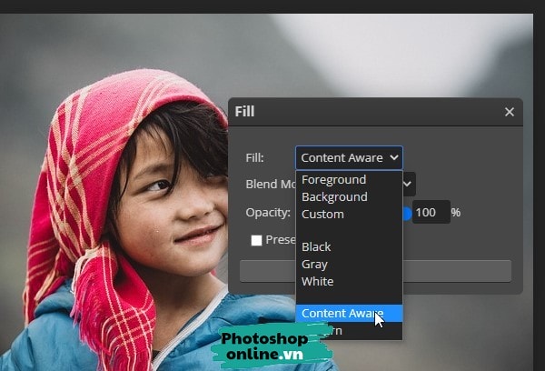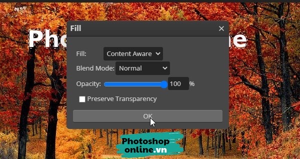 Một hộp thoại sẽ xuất hiện, tại dòng Fill, bạn chọn tính năng có tên là Content Aware ➜ Bấm Ok rồi chờ một chút để Photoshop online xử lý ảnh.